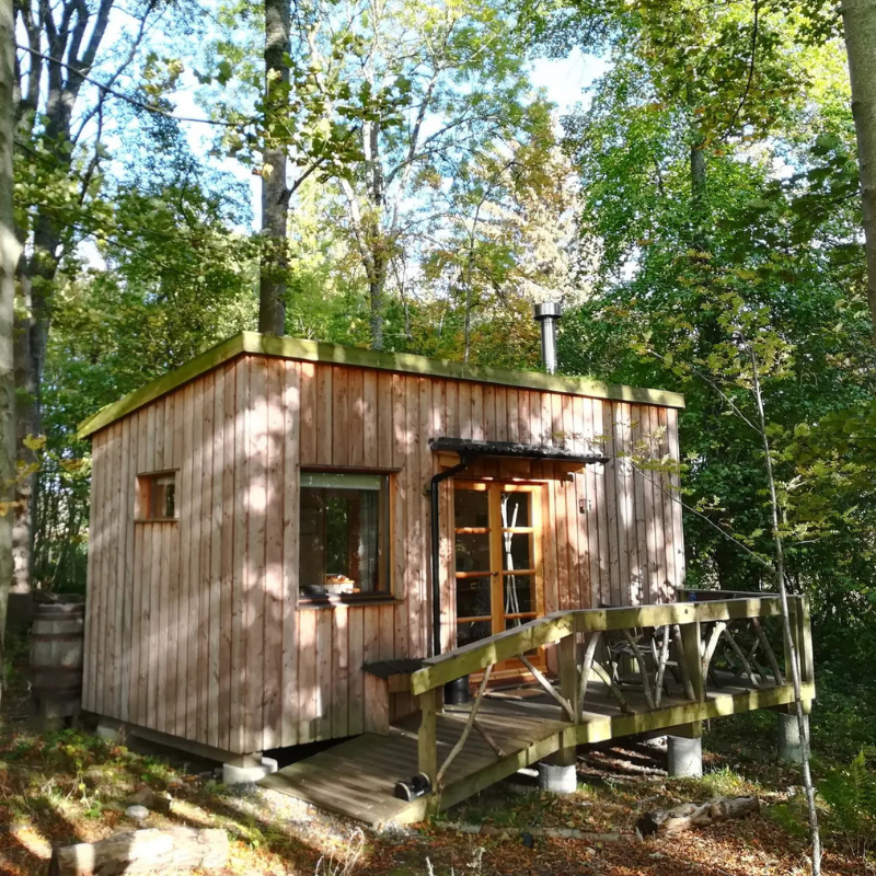 In a peaceful woodland, these handcrafted eco-cabins offer a stylish yet low-impact getaway. Each cabin features a double bed, wood-burning stove, kitchenette, cozy seating, and a rustic bathroom with compost toilet and bucket shower. Solar powered lighting, recycled furnishings, and a deck overlooking forest and fields. perfect for reconnecting with nature and yourself.